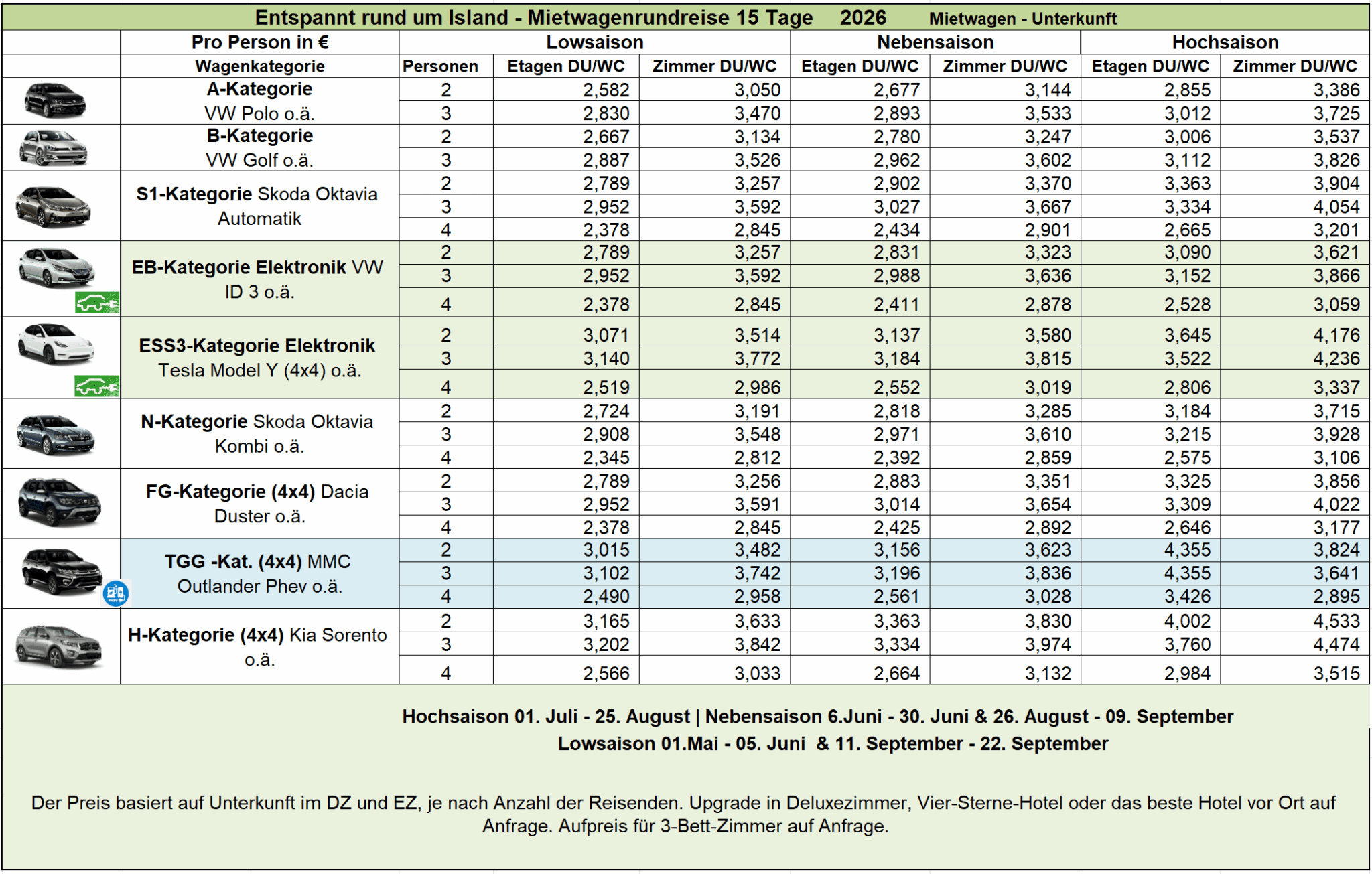 Wir bieten die Anreise nach Island mit der Fähre Smyril-Line ab Hirtshals in Dänemark an. Sie können mit dem eigenen Fahrzeug anreisen oder haben die Möglichkeit, ber der Ankunft in Seyðisfjörður, im Osten Islands, einen Mietwagen übernehmen. Wir machen Ihnen gerne ein individuelles Angebot mit Reiseroute und Unterkünften.
