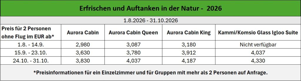 Diese Reise lädt dazu ein, Abstand vom Alltag zu gewinnen und die ruhige, weite Natur Lapplands in ihrer herbstlichen Schönheit zu genießen. Sie wohnen im Apukka Resort, idyllisch am See gelegen und umgeben von goldgelben Wäldern, stillen Pfaden und der klaren Luft des Nordens. Hier erleben Sie Lappland in seinem eigenen Rhythmus: bei Waldwanderungen, beim Kanufahren auf glitzernden Seen und in Ihrer privaten Sauna am Wasser, die wohltuende Wärme und tiefe Entspannung schenkt. Wer noch mehr erkunden möchte, kann die vielen selbst geführten Wanderwege rund um den Polarkreis nutzen und die Natur ganz für sich entdecken. Eine Reise, die entschleunigt, erdet und Ihnen die sanfte Kraft der arktischen Landschaft näherbringt.