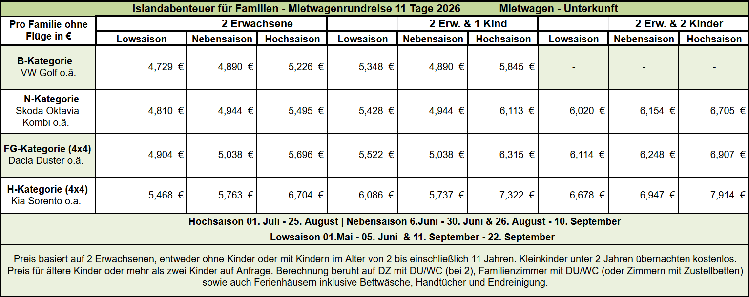 Bereiten Sie sich und Ihren Kindern einen unvergesslichen Urlaub im wunderschönen und kinderfreundlichen Island! Auf dieser Rundreise mit zwei längeren Aufenthalten in Ferienhäusern im Norden und Süden können Sie wild lebende Tiere aus nächster Nähe erleben und sich bei zahlreichen Aktivitäten so richtig austoben! Das Baden in heißen Quellen, eine Walbeobachtung oder ein Ausritt auf Islandpferden begeistern sowohl Groß als auch Klein. Bringen Sie Ihren Kindern die Entstehung der Erde in spektakulären Landschaften mit Lavafeldern, Höhlen und Kratern näher und erleben Sie in der Gletscherwelt des Südens auch die eisige Seite Islands. Entspannen Sie sich im Wechsel in familienfreundlichen Gästehäusern, in Bauerngasthöfen mit Tieren und in großzügigen Ferienhäusern für Selbstversorger.