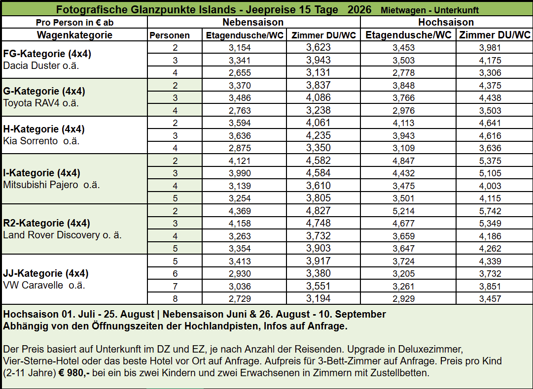 Separate Kosten: Treibstoff, Verpflegung, Eintritte und evtl. Maut für den Tunnel Hvalfjarðargöng. Zusatzfahrer 45€