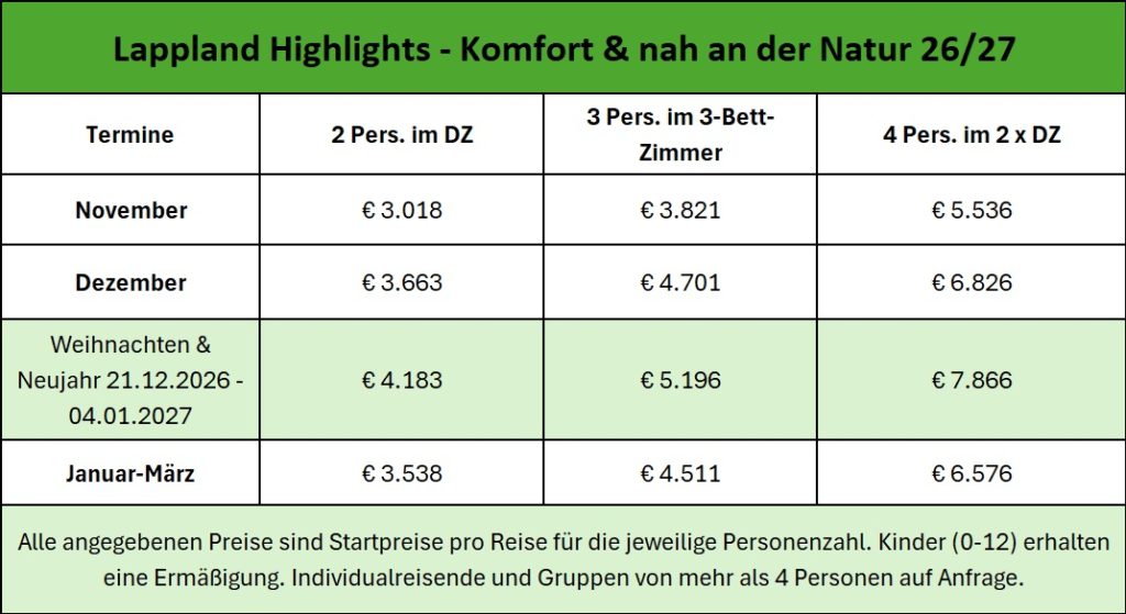 - Transfers vom und zum Flughafen/Bahnhof Rovaniemi