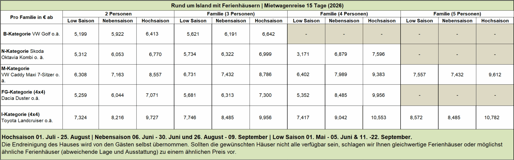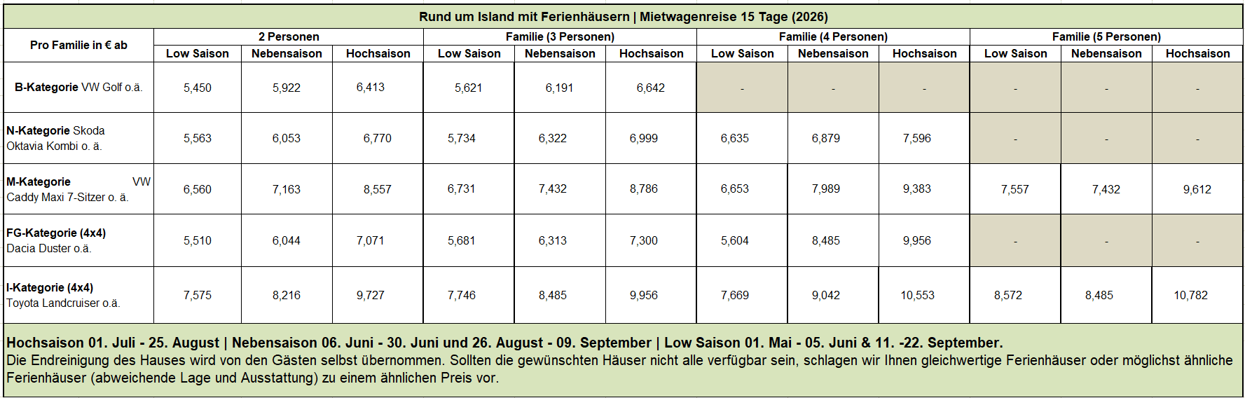 Der angegebene Reisepreis ist ein Beispielpreis bei Buchung der Reise mit Unterbringung in den konkret genannten Ferienhäusern (im mittleren Preissegment): 3 Ü in Ferienhaus Heillasteinn (West), 4 Ü in Ferienhaus Björk (Nord), 3 Ü in Ferienhaus Heldusteinn (Ost), 1 Ü/F Glacier Lagoon Hotel (Süd-Ost), 3 Ü in Ferienhaus Augabrun (West) und 1 Ü/F in Hotel Vogar (Flughafennähe). Je nach Flugzeit buchen wir die erste oder die letzte Nacht in Flughafennähe.