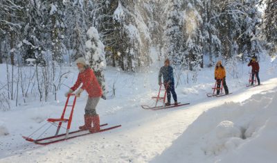 Heute steht ganz im Zeichen der Natur: Kinder sausen auf dem Schlitten den Hang hinunter, bauen Schneemänner oder spielen im tiefen Pulverschnee. Die Erwachsenen genießen die klare Luft bei einer kleinen Wanderung durch den umliegenden Nationalpark. Am Abend wartet die warme Sauna – der perfekte Ausklang eines ersten Wintertages.