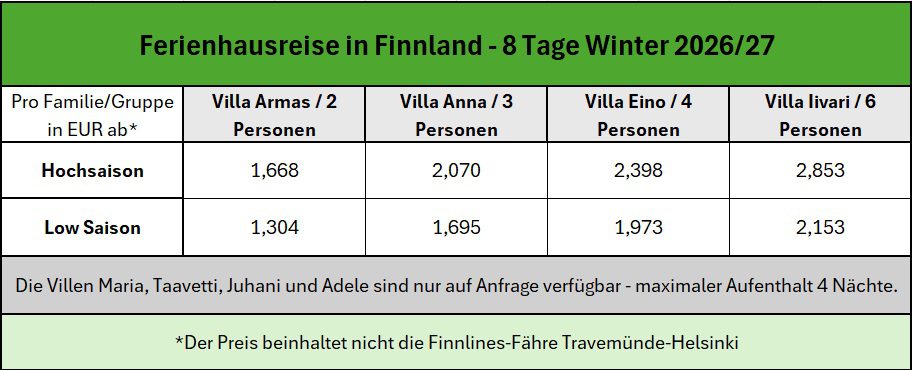- Villas Armas, Anna, Eino und Iivari 18.12.2026 – 6.1.2027.