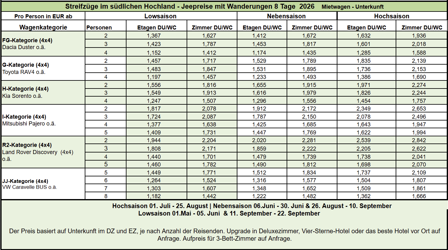 Streifzüge im südlichen Hochland | Jeepreise mit Wanderungen 8 Tage