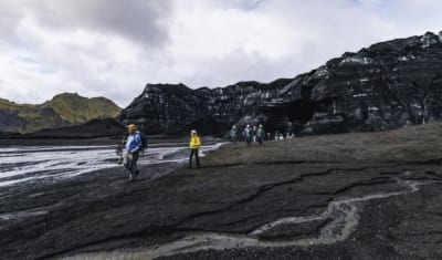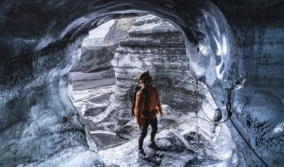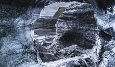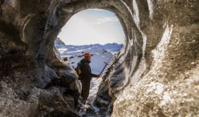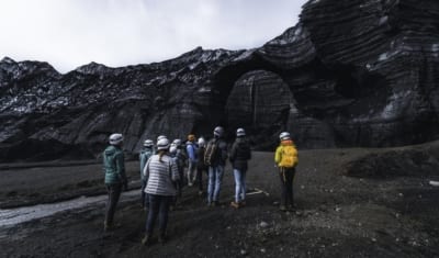Vom Treffpunkt in Vík geht es mit dem Super Jeep durch die Sander am Fuße des Vulkans Katla bis zum Gletscher Mýrdalsjökull. Dort können Sie eine Eiswand bestaunen, die von Ascheschichten vergangenener Vulkanausbrüche durchzugen ist. Mit der passenden Ausrüstung und dem Guide geht es dann in die natürlichen Eishöhlen, die sich dort durch Schmelzwasser gebildet haben. Die Tunnel im Eis sehen von Mal zu Mal verschieden aus, ganz abhängig vom Wetter, den Temperaturen, der Jahreszeit und dem Zeitpunkt des Besuches. Mal schimmern Sie blau und das Eis ist glasklar, ein andermal fließt die Asche an den Wänden herunter und bildet faszinierende Kunstwerke. Diese Tour ist auch für Familien geeignet, da man nur wenige huntert Meter bis zum Höhleneingang laufen muss.