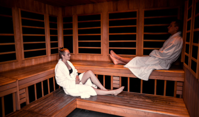 Zudem können die Gäste den Ruheraum im Badebereich besuchen, wo Sie sich bei beruhigender Musik und einem knisternden Kamin entspannen.